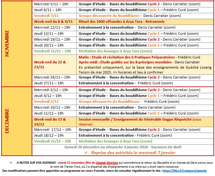 Chers amis, voici le programme d’ici à la fin de l’année, légèrement modifié: 2 séances de concentration ont été décalées pour passer du 13 au 27 novembre et du 11 au 18 décembre.