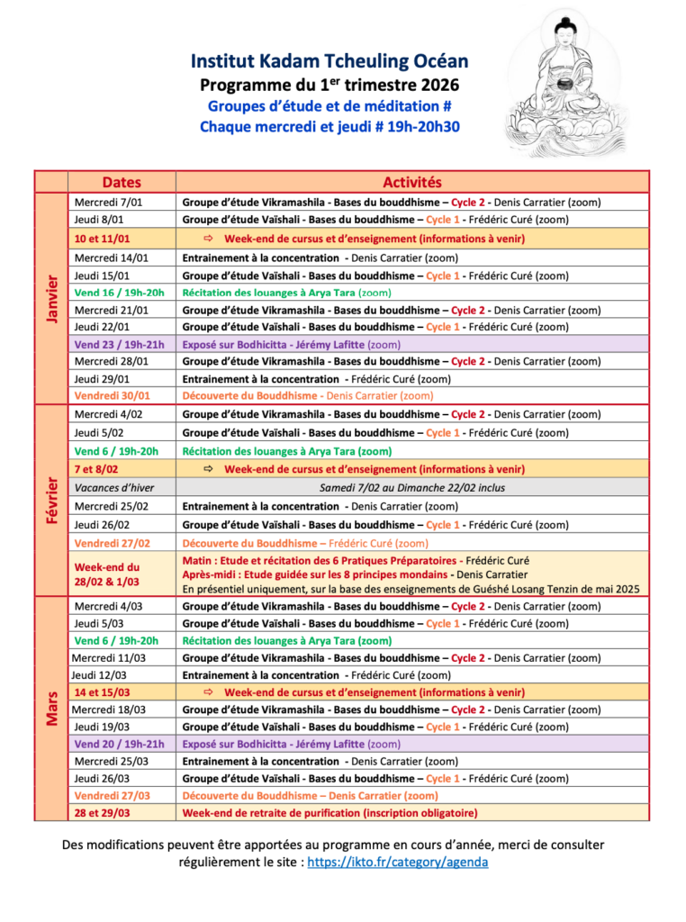 - les 10 et 11 janvier: week-end mensuel de cursus à Veneux, programme et enseignement du Vénérable Dagpo Rinpoché sous réserve
