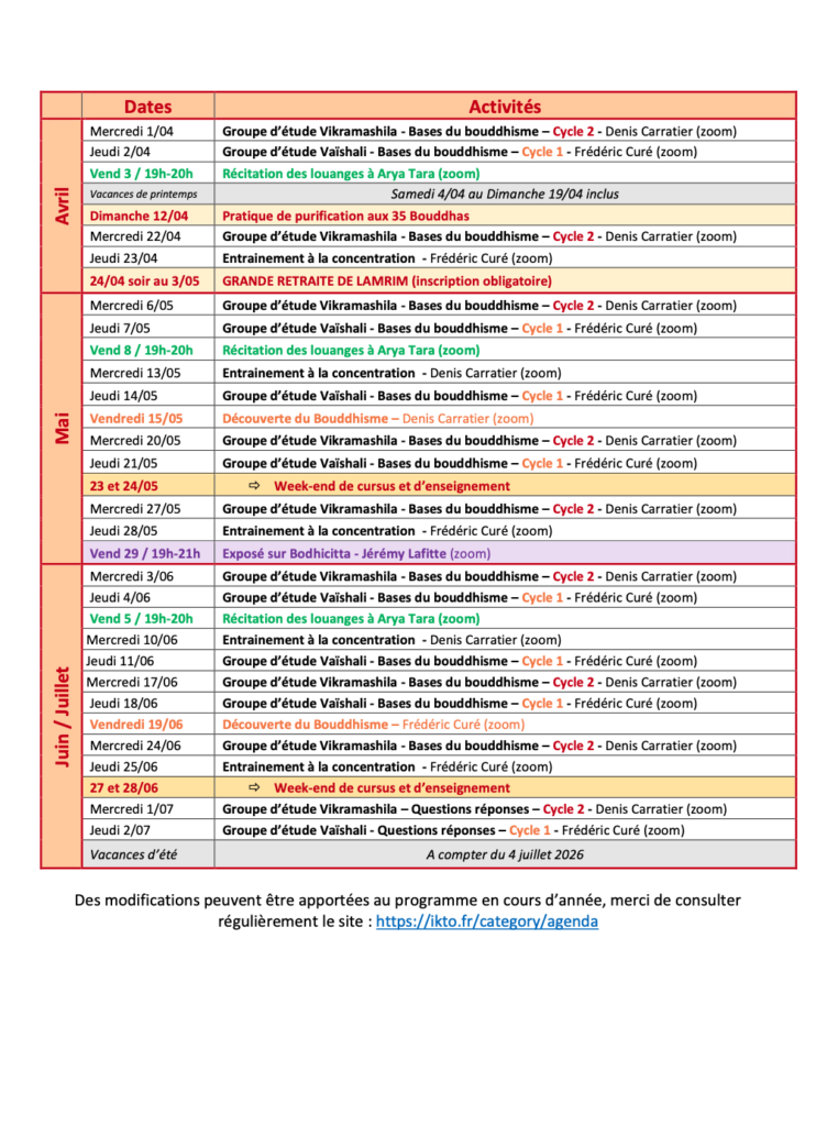 Vous trouverez ci-joint, notre programme d’activités du premier semestre 2026 jusqu’aux vacances d’été.